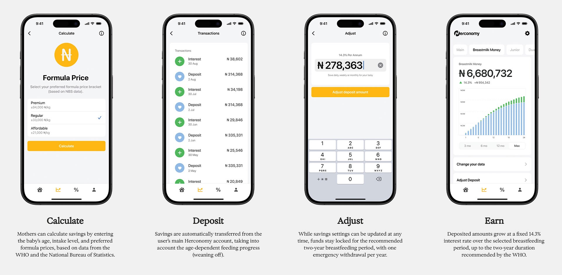 In the Herconomy app, mothers can calculate how much they save by breastfeeding instead of buying formula. Each month, that amount is automatically transferred to the Breastmilk Money savings account, earning 14.3% interest— mirroring the proven developmental benefits of breastfeeding.