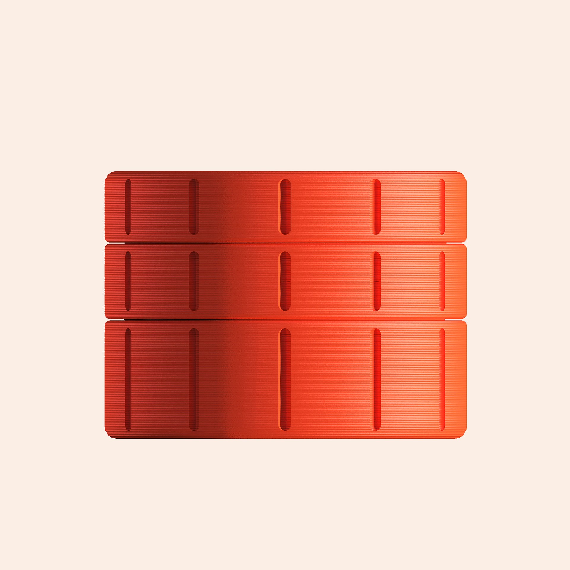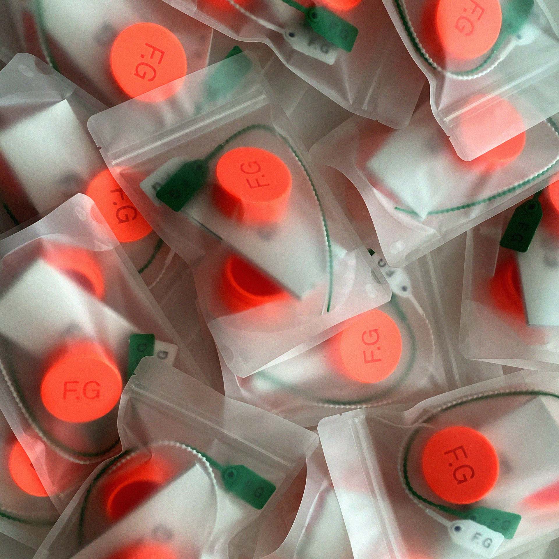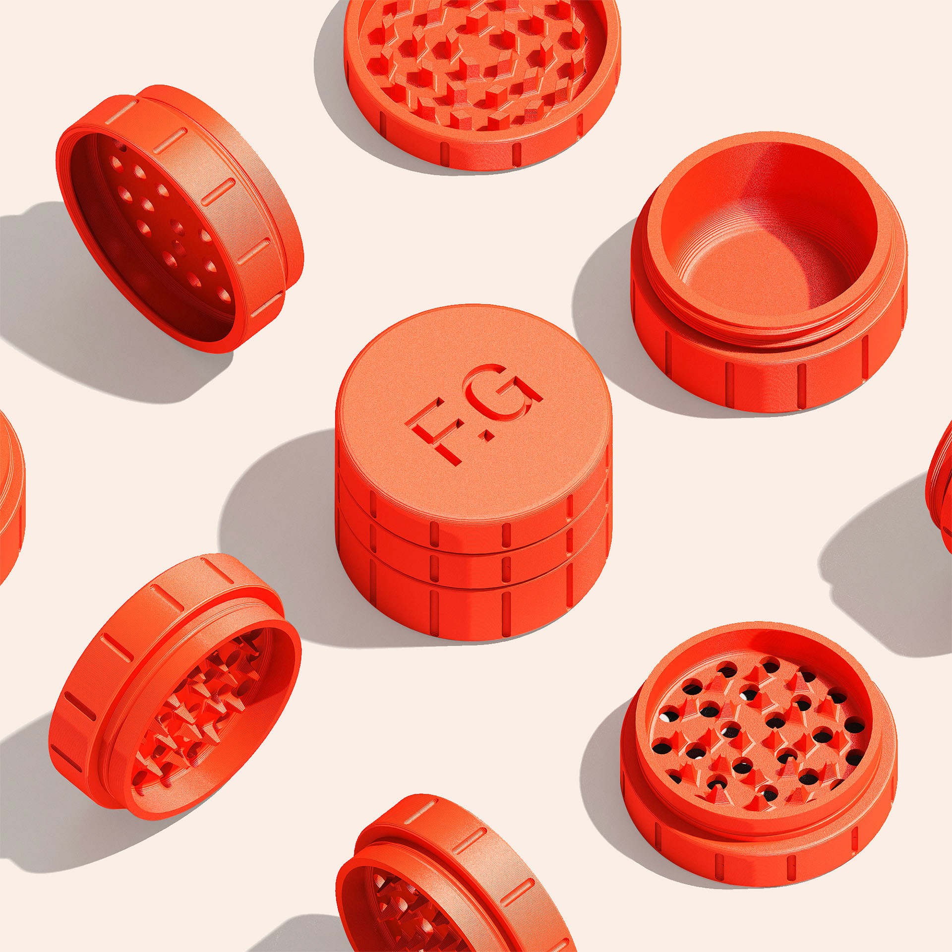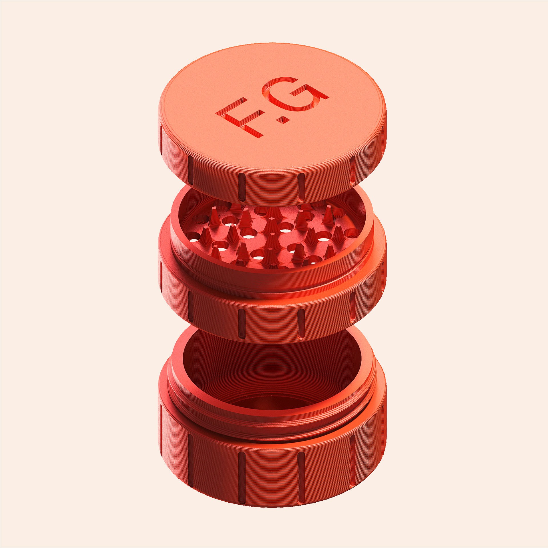 The grinder is 3D printable and made of orange filament. Each grinder features the F.G monogram. The three-piece structure follows the design themes of the project and is available as an open-source asset for the public.