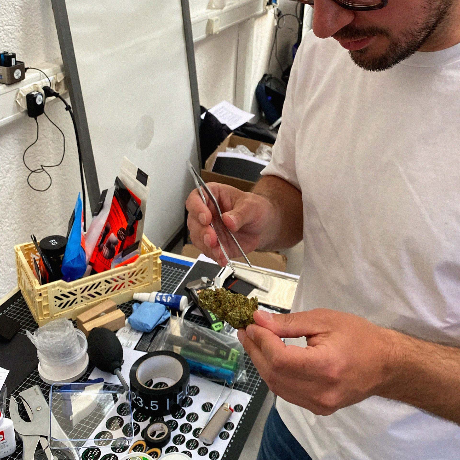 The custom type has two fonts: extended and condensed. Each character was constructed from two perspectives — from inside the grid and outside to show the contradiction between the treatment of consumers and cannabis prisoners. The brand monogram represents the unusual amounts (in grams) of cannabis, precise up to one decimal point.