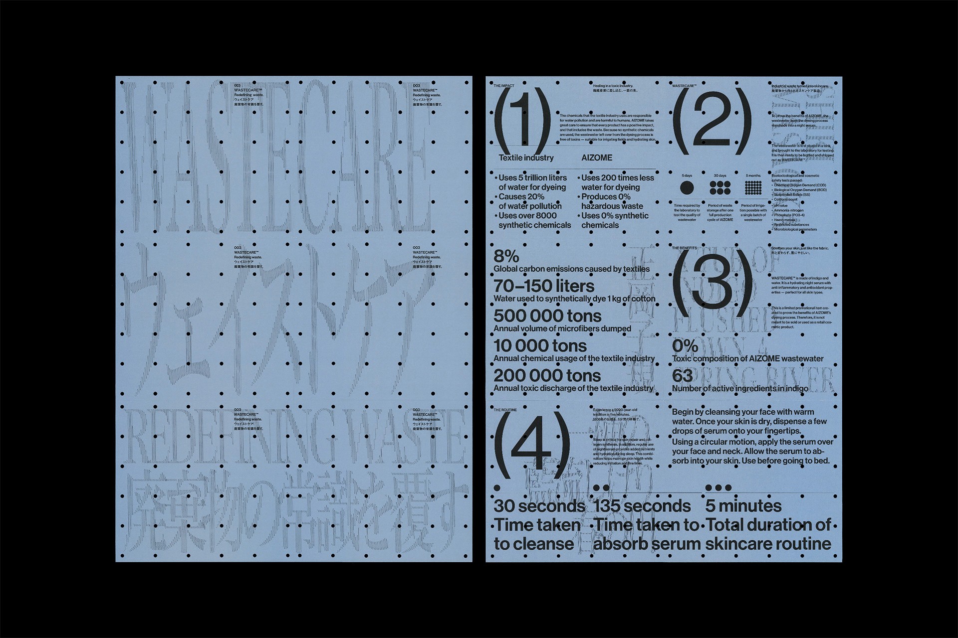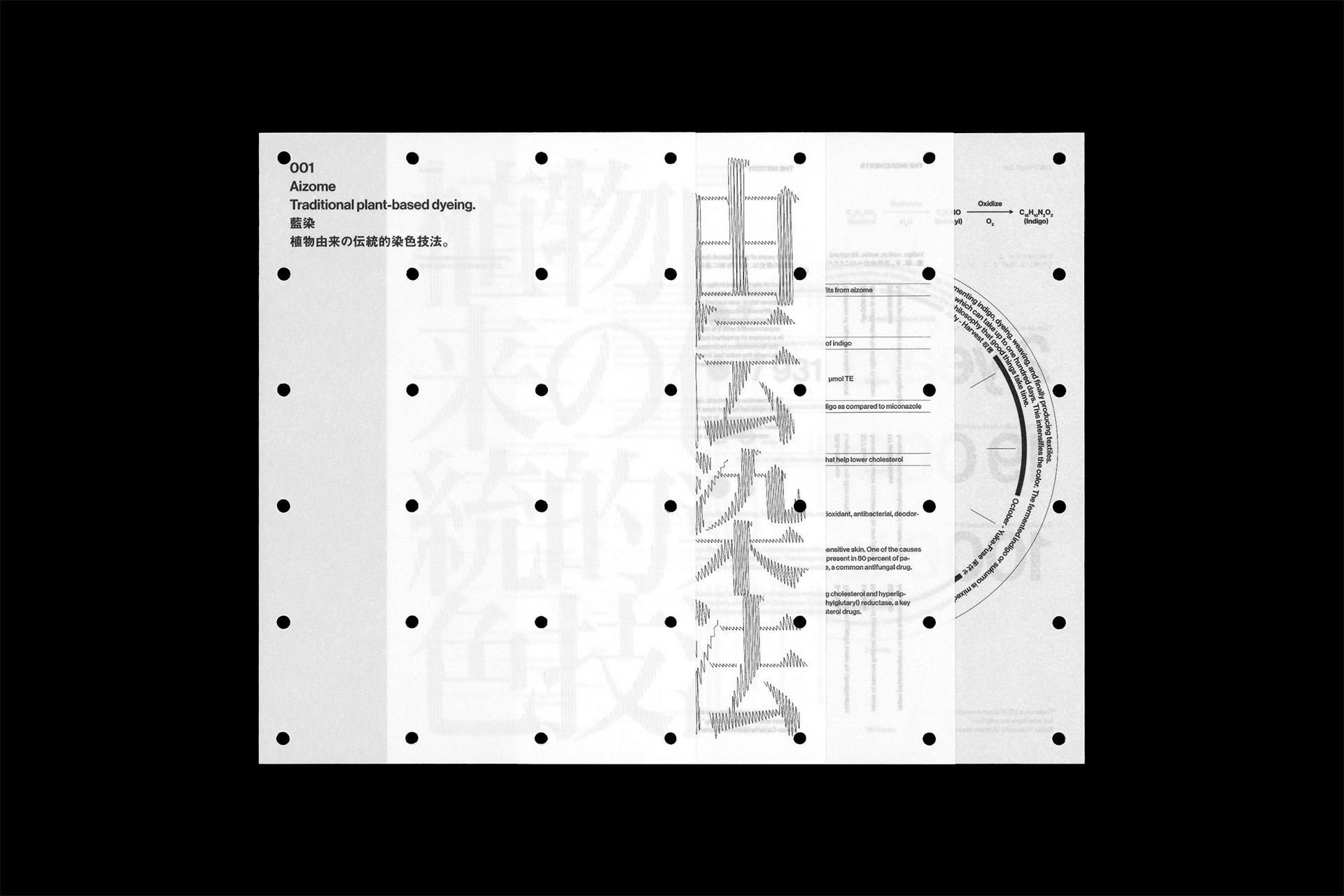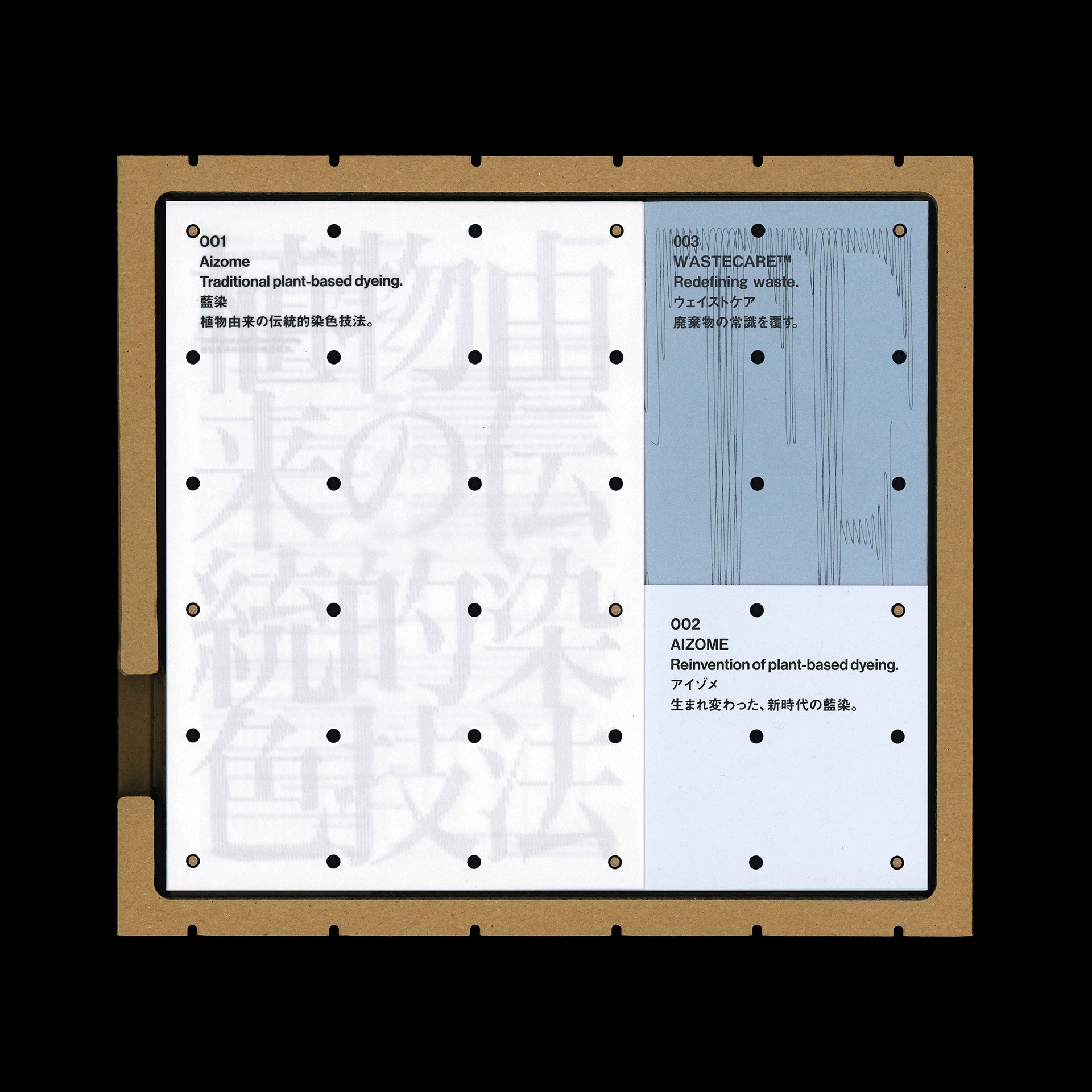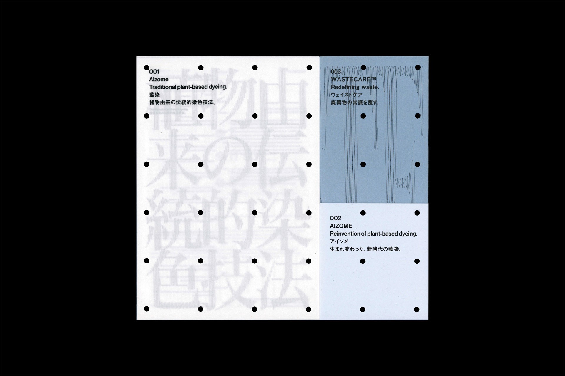 Three printed materials — a set of leaflets, a booklet, and a poster — provide information on the history, AIZOME, and WASTECARE™. The reader is guided by a six-by-six grid pin registry that binds the perforated materials, inspired by the dyeing process. Likewise the color of the materials intensifies, from translucent white to dark indigo.