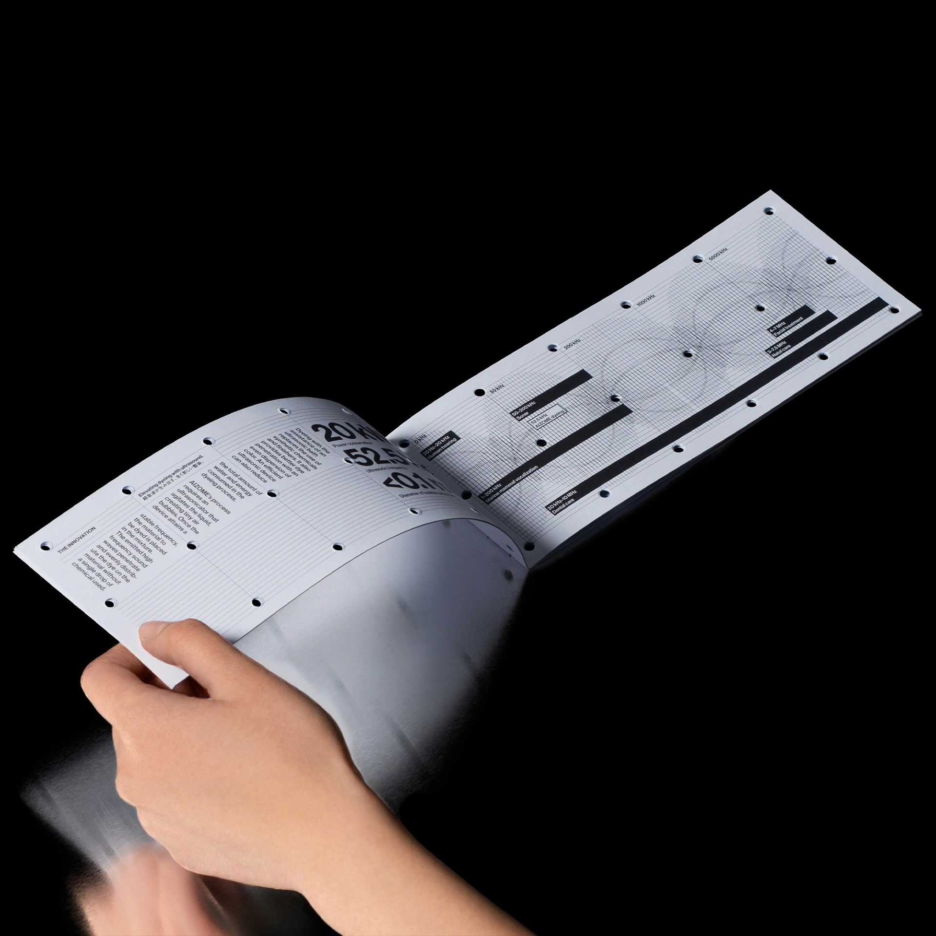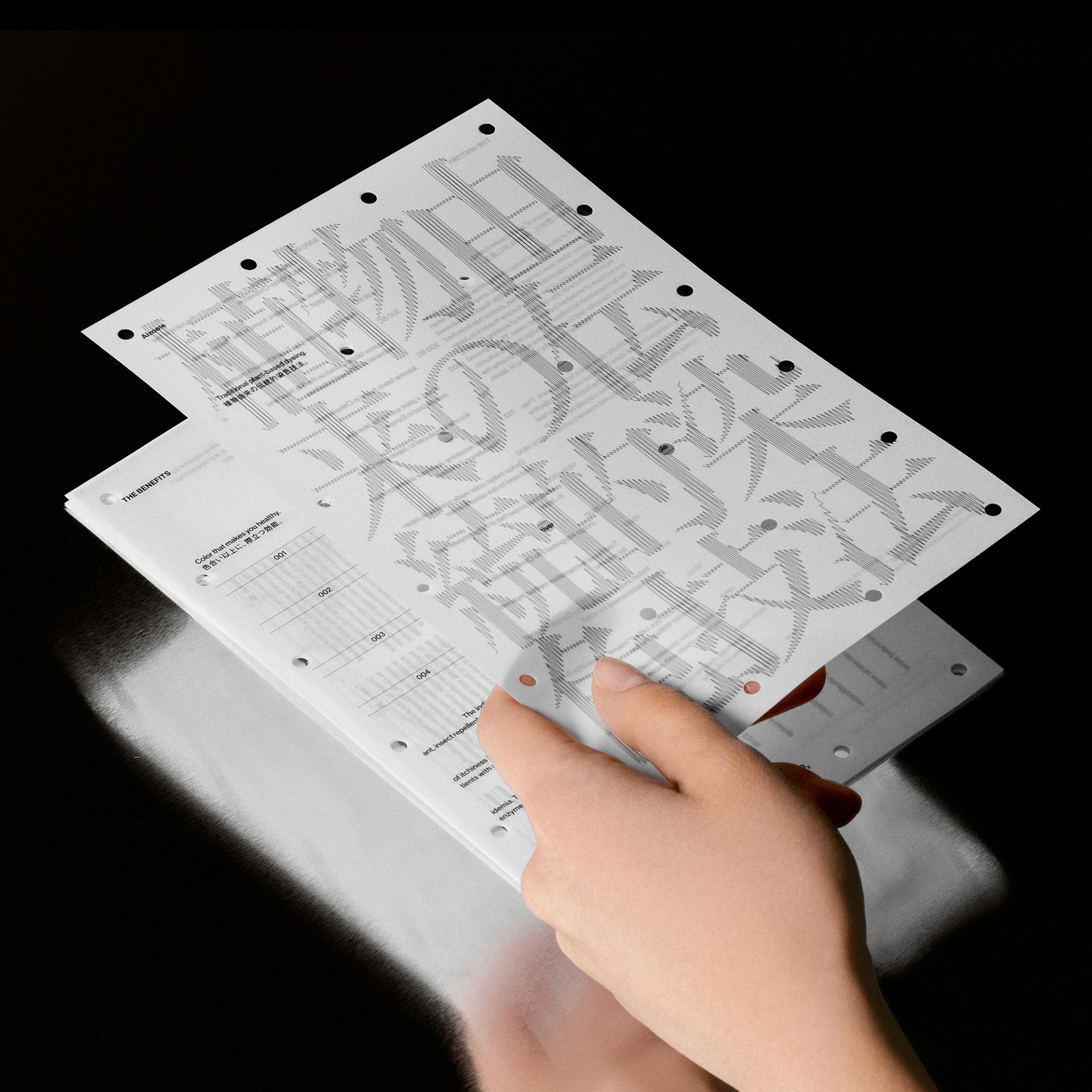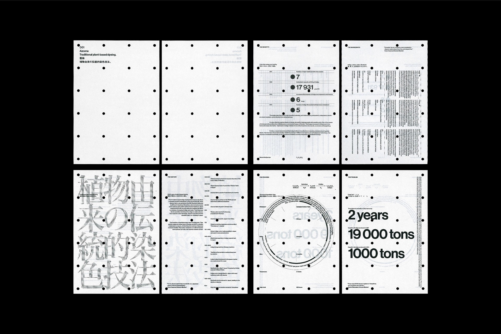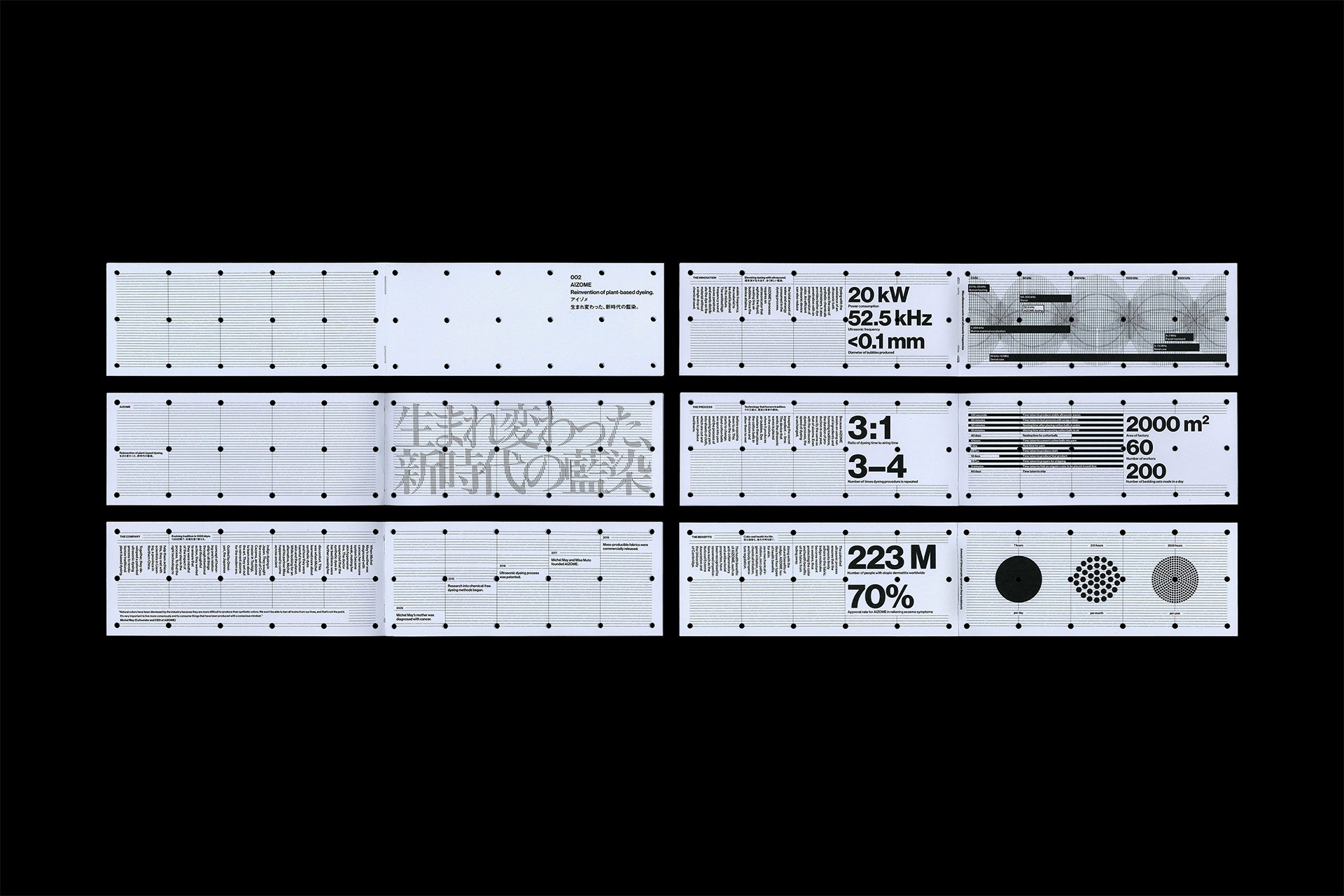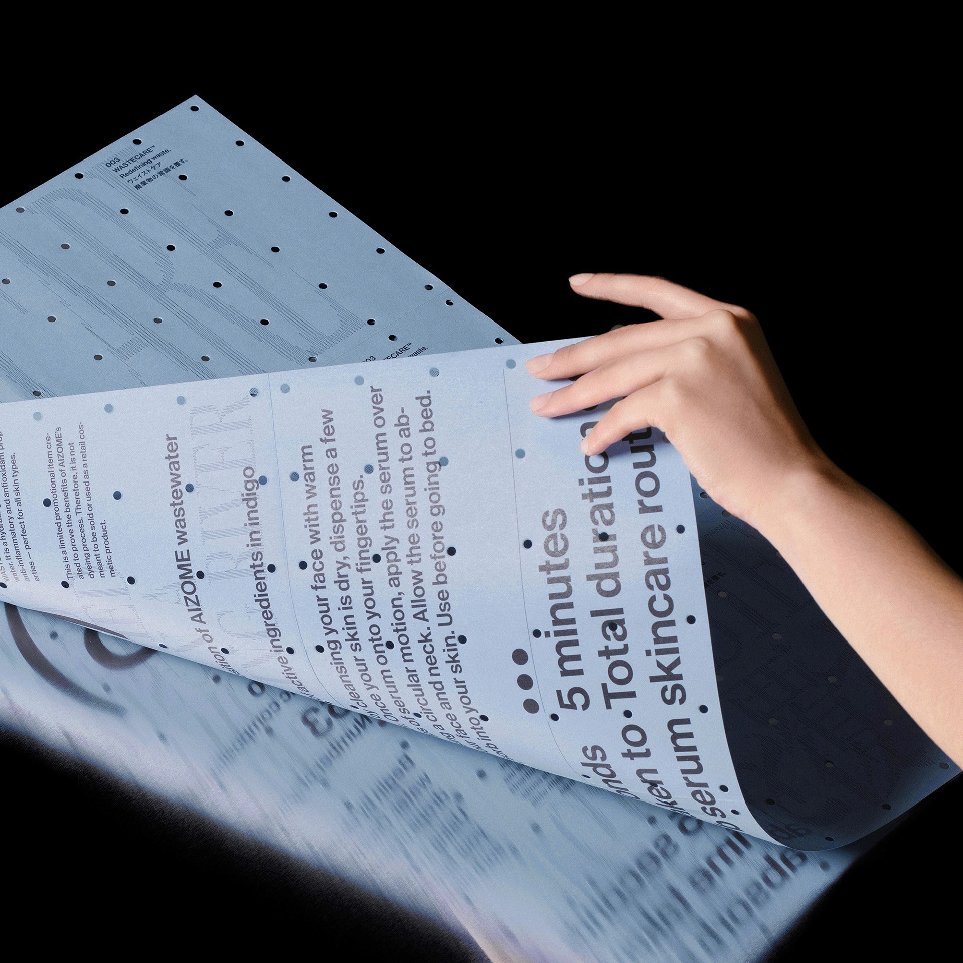 Three printed materials — a set of leaflets, a booklet, and a poster — provide information on the history, AIZOME, and WASTECARE™. The reader is guided by a six-by-six grid pin registry that binds the perforated materials, inspired by the dyeing process. Likewise the color of the materials intensifies, from translucent white to dark indigo.