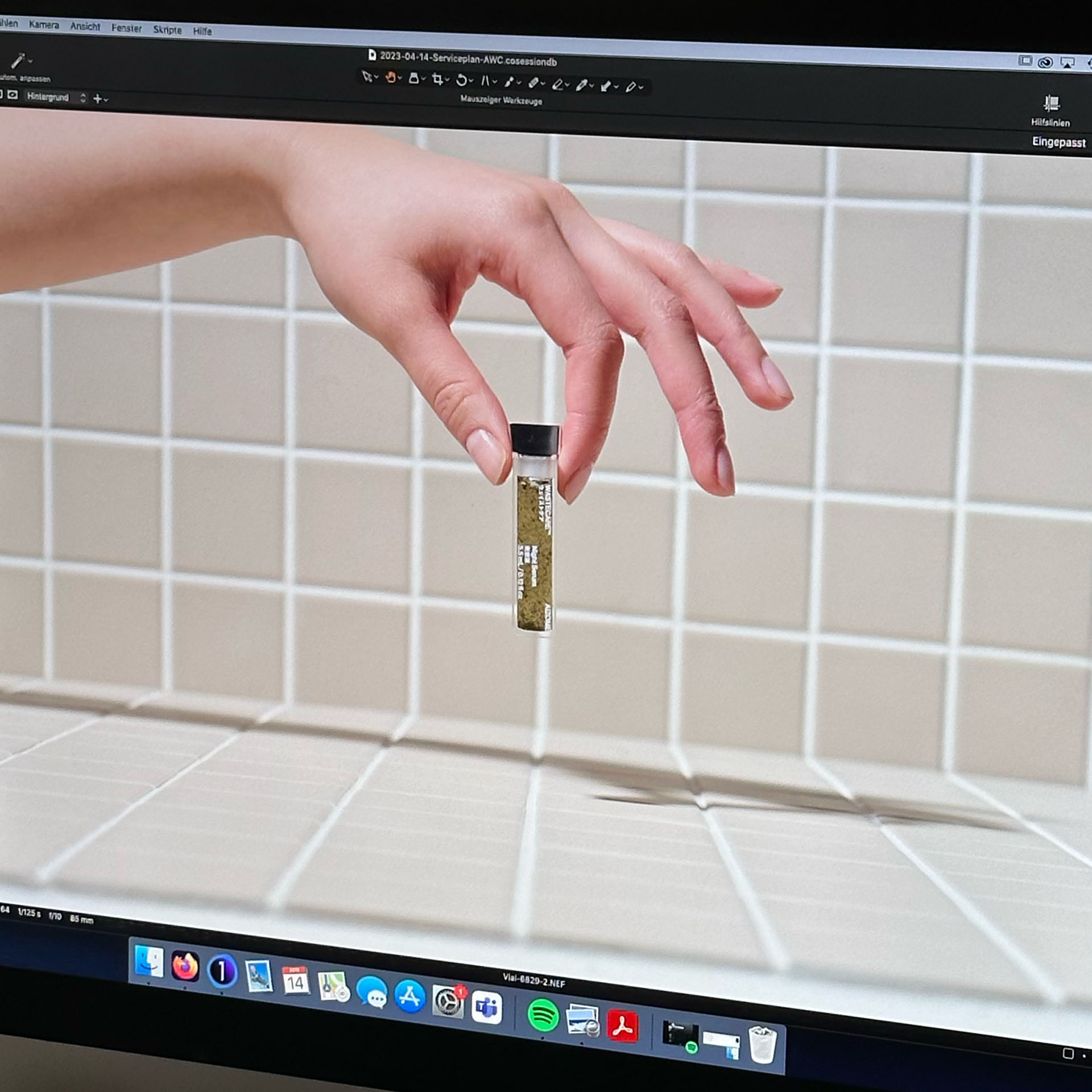 To highlight that WASTECARE™ is delivered straight from the factory, a rectangular lab glass vial was repurposed as a container. The custom lid is made from recycled aluminum and ergonomically designed. For easy application, a reusable glass pipette without a plastic suction cup was chosen.