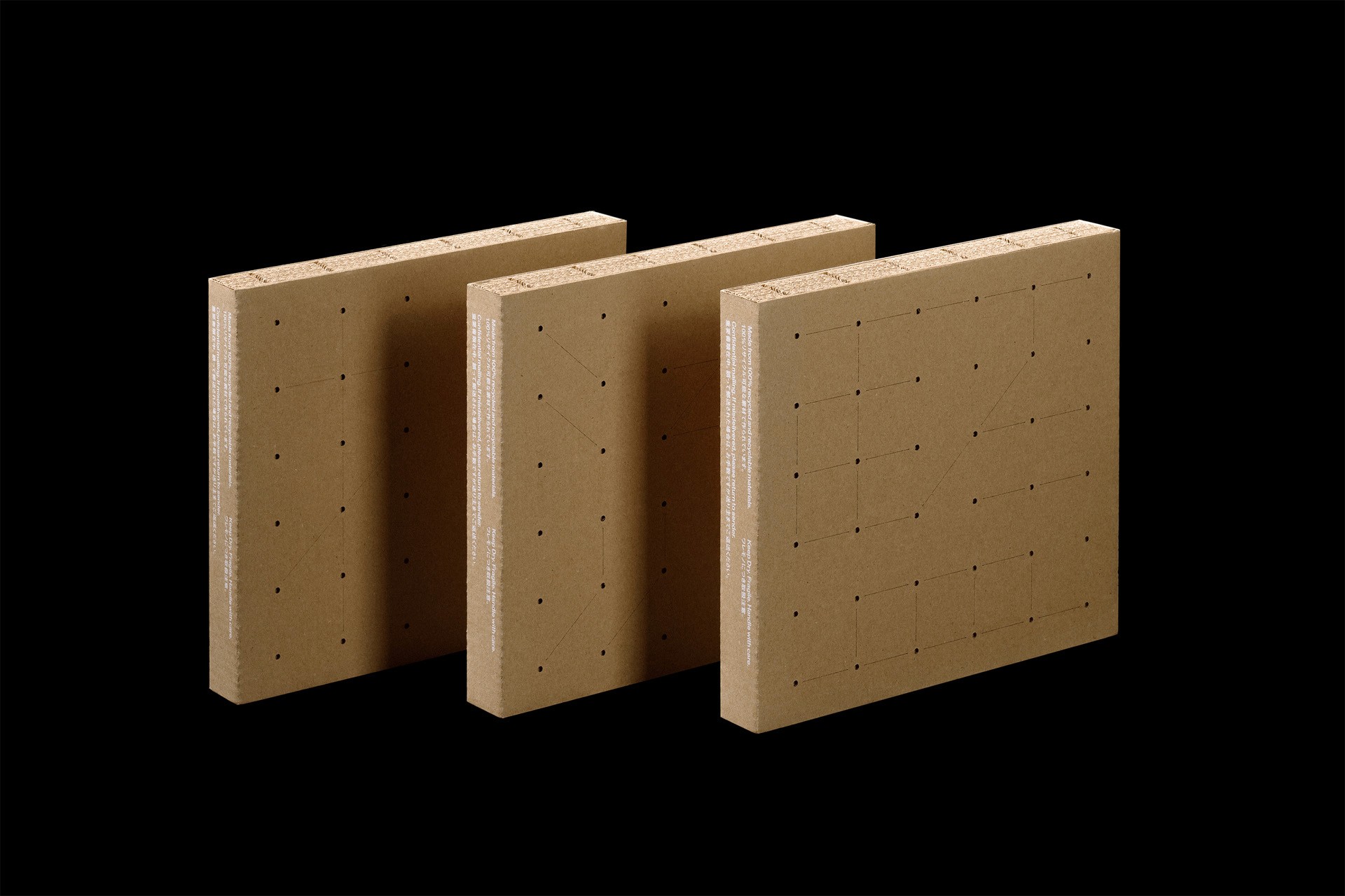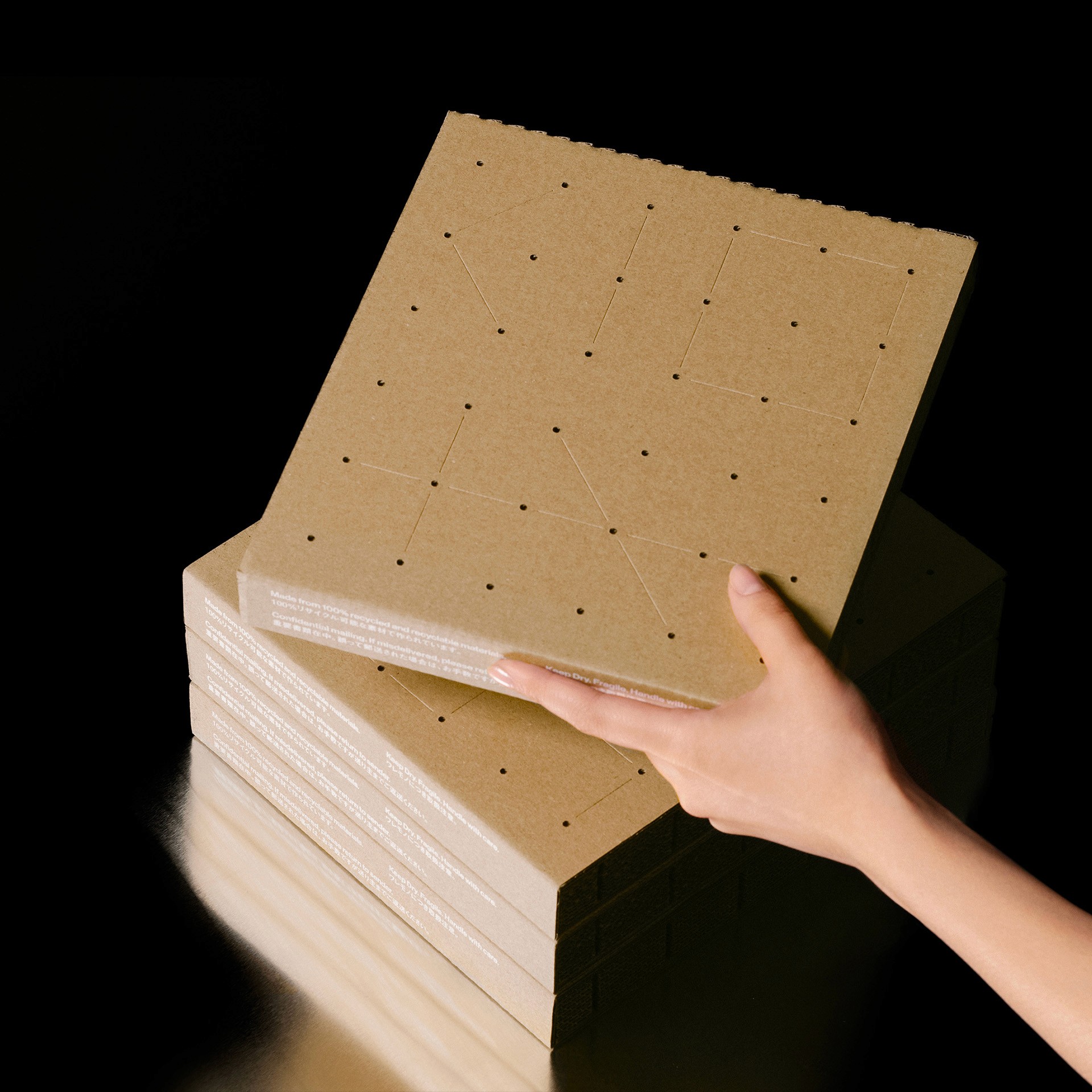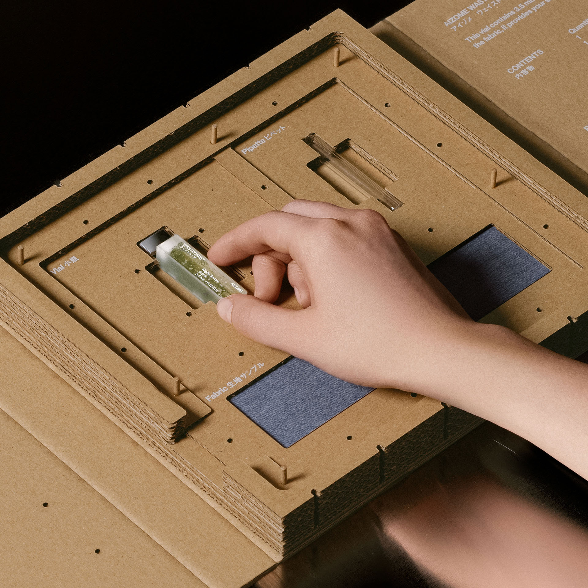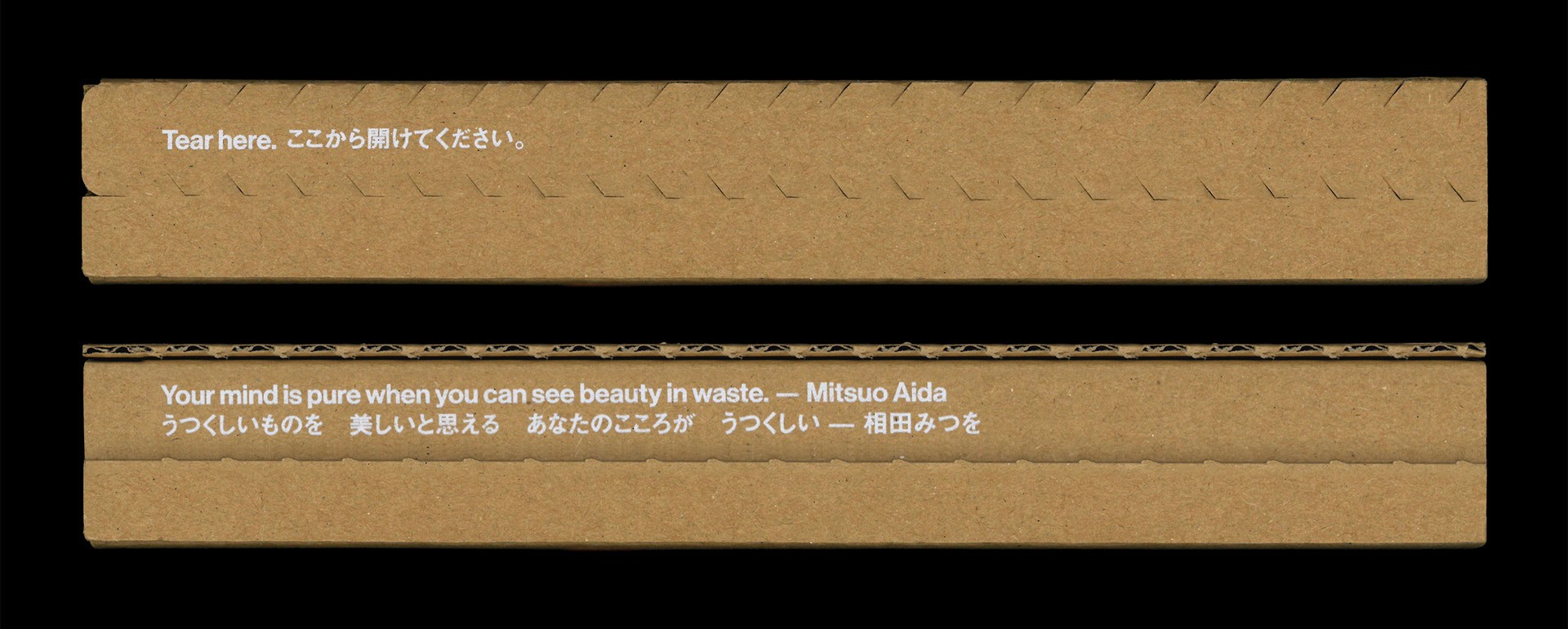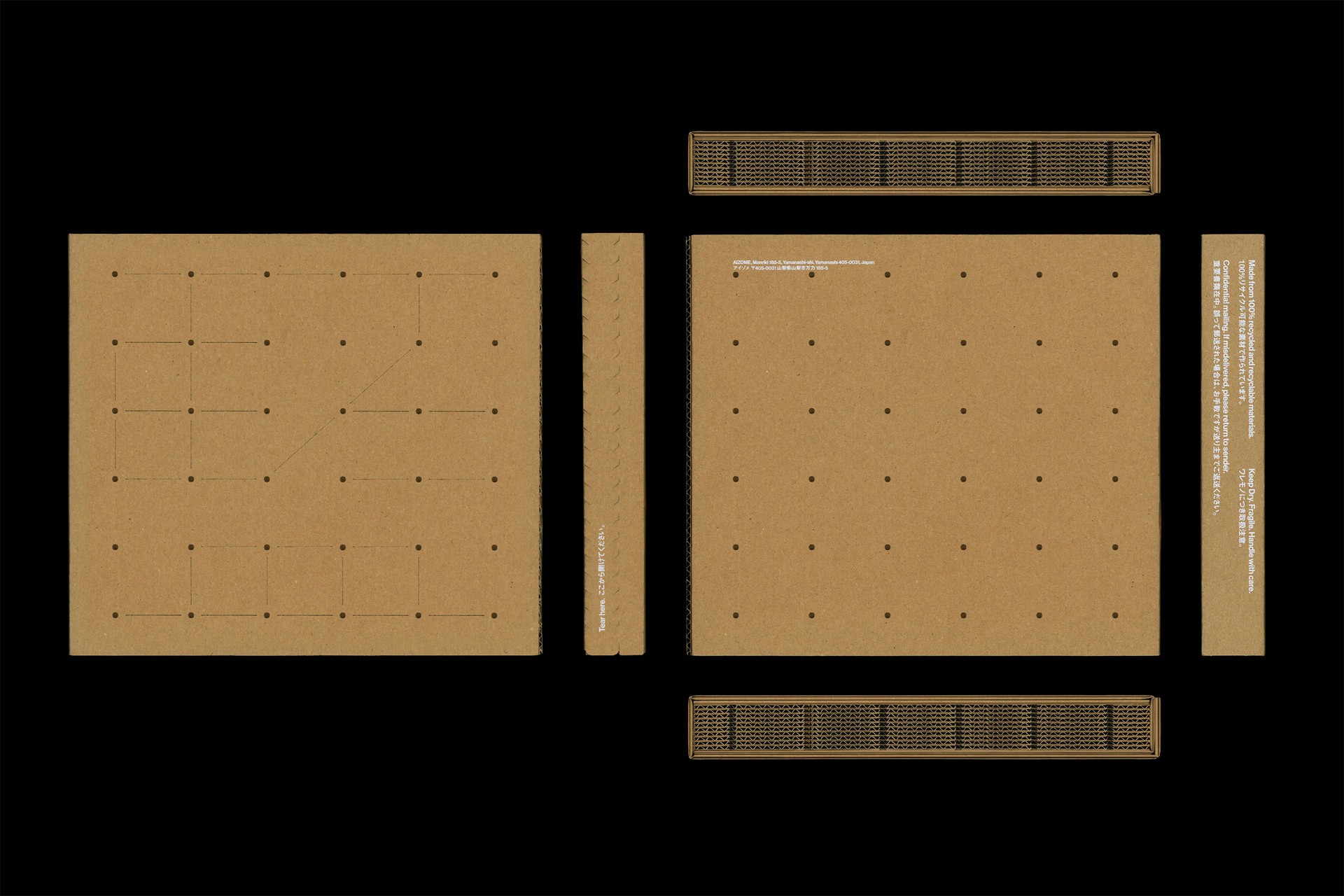 The packaging is made from recycled and recyclable cardboard, layered for stability. This eliminates the need for an outer box, effectively reducing emissions. The front cover comes in three variations, with thin lines cut between the holes to form the Japanese characters 藍 (indigo), 流 (flow), and 拾 (cherish).