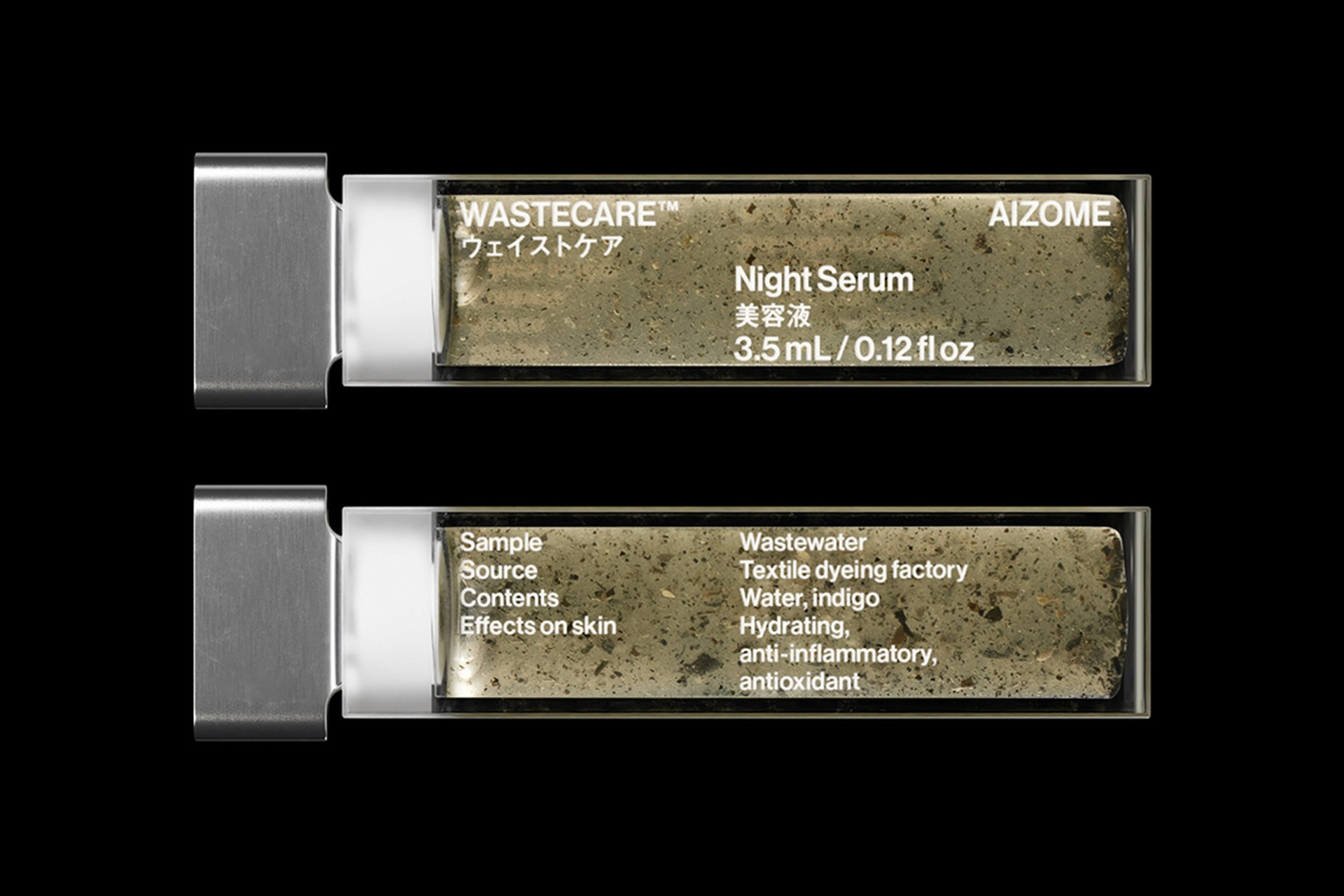 The 210mm x 190mm poster colored in deep indigo puts data in context to illustrate the advantages of AIZOME ULTRA™ over industrial dyeing with synthetic chemicals. It also explains the background and benefits of the WASTECARE™ night serum and provides directions for its application.